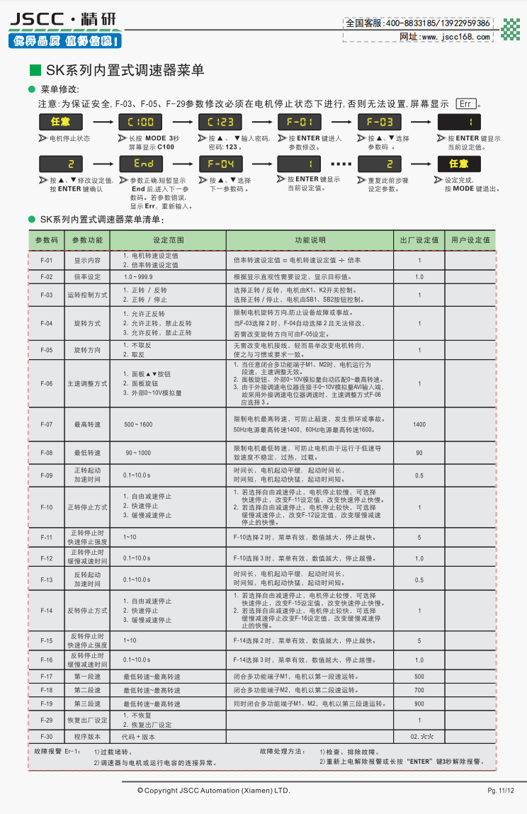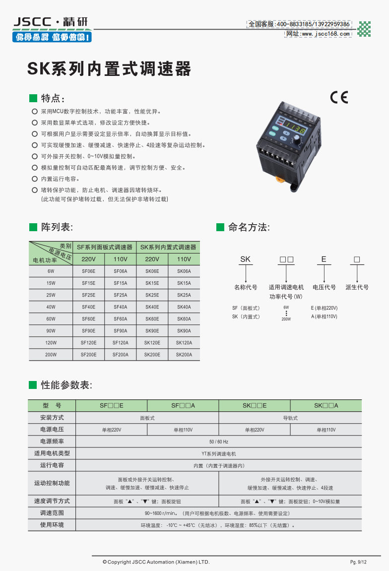精研電機(jī)始終秉承“精益求精,研發(fā)創(chuàng)新”的理念為客戶提供優(yōu)質(zhì)可靠的產(chǎn)品。 SK系列內(nèi)置式調(diào)速器是SNT系列調(diào)速器的升級版,在外觀上SK系列使用數(shù)顯菜單,修改設(shè)定方便快捷。而在功能上,其除了擁有SF系列面板式全部的功能外,新增的多段速控制,模擬量控制等功能給了電機(jī)控制更多的可能性。 提示SF系列需要搭配我司YT系列調(diào)速電機(jī)使用,在選購本產(chǎn)品時(shí)請注意。