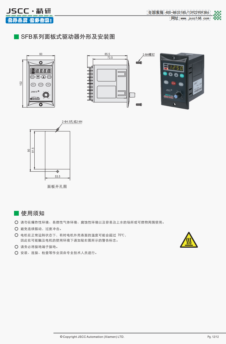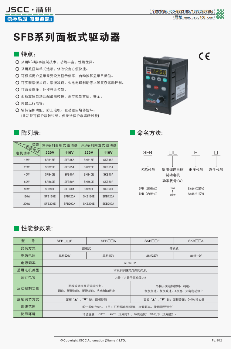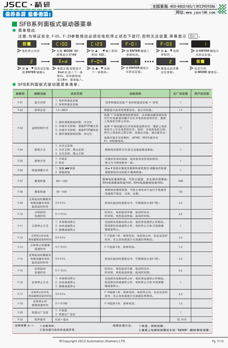 精研電機始終秉承“精益求精,研發創新”的理念為客戶提供優質可靠的產品。 SFB系列面板式調速器是精研以SF系列調速器為基礎,專為YF系列調速電磁制動電機設計,從而誕生的衍生產品,在外觀上與SF系列同樣使用數顯菜單,修改設定方便快捷。在功能上,除了緩慢加減速等功能之外,新增加的失電電磁制動控制幫助用戶更好控制電磁制動器。 提示SFB系列需要搭配我司YF系列